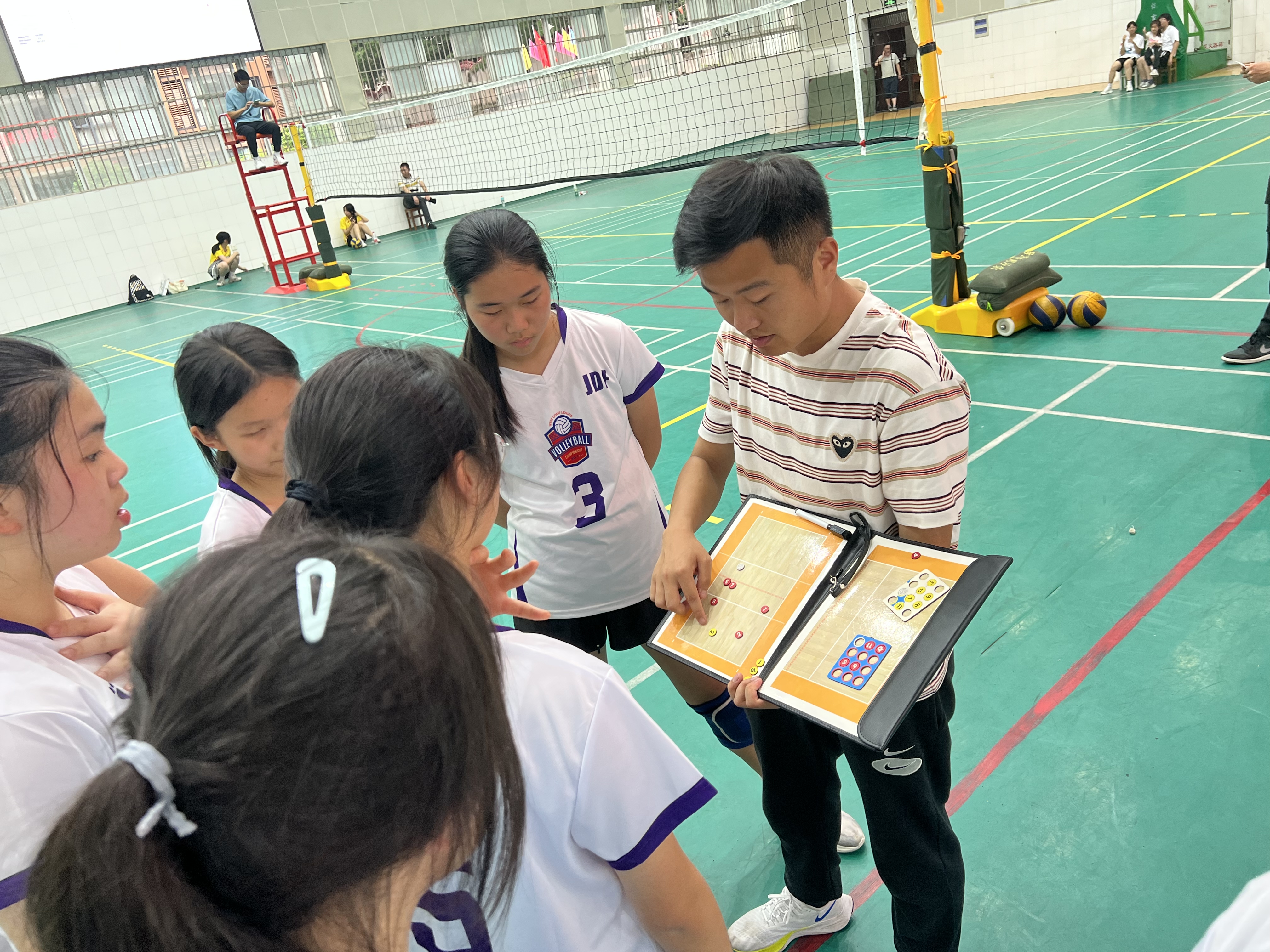 本次比赛分为甲乙两组,共八支队伍参赛。我校女排姑娘们势如破竹,在与宜昌市六中、十一中及十七中的比赛中三战三捷,最终夺得冠军!本次比赛的胜利离不开排球队全体队员的勤奋练习,充分展现了金初学子的风采。