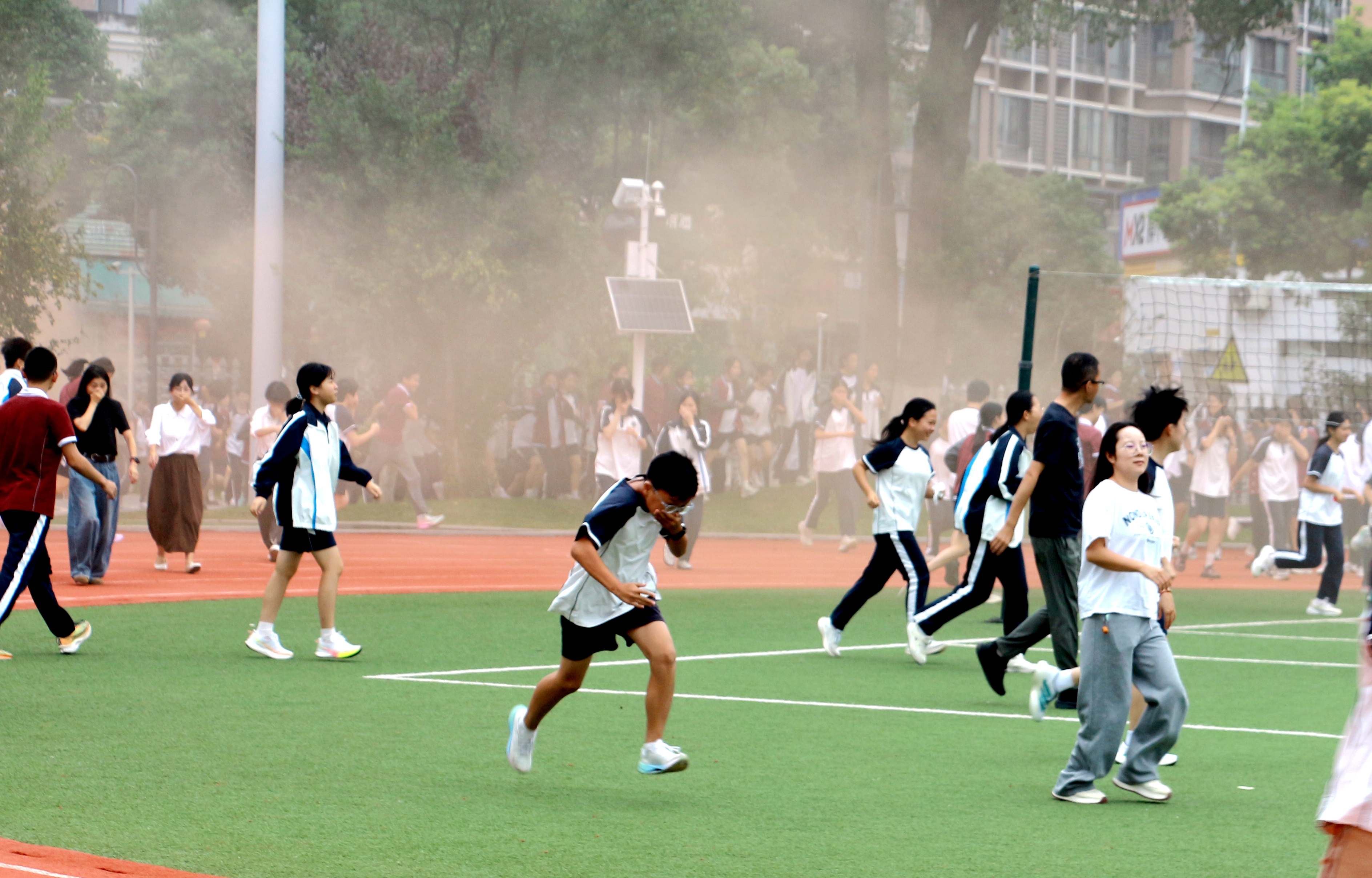 上午9时50分,急促的警报声在校园响起,消防演练正式拉开帷幕。学生们迅速用湿毛巾捂住口鼻,在老师引导下,沿预定疏散路线,从教学楼各个教室有序快速撤离至操场集合点。各班清点人数后,各年级部主任分别向现场总指挥、校长周文汇报,确保全体学生安全到位。学生发展处主任陶李华对本次演练情况进行了总结,肯定了师生们的沉着表现并指出待改进之处。