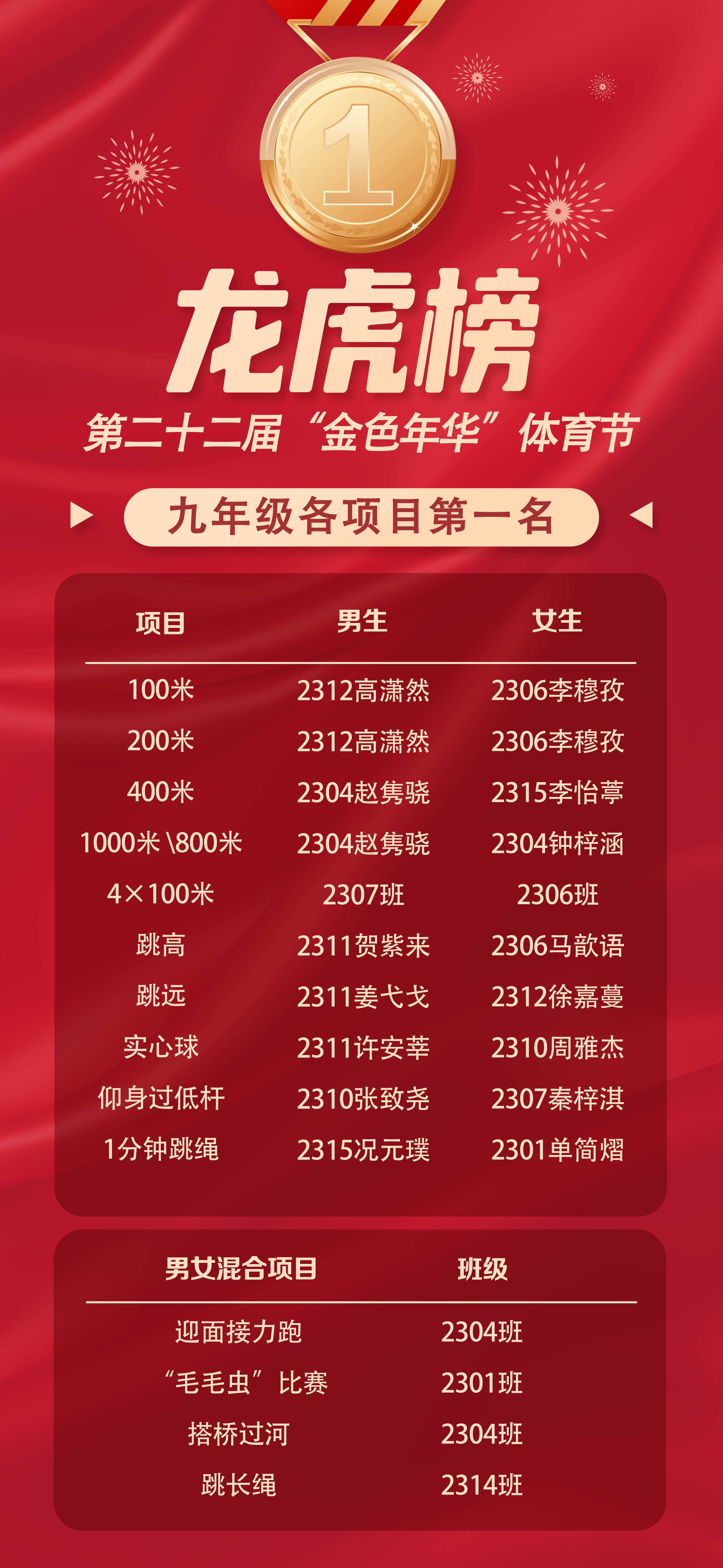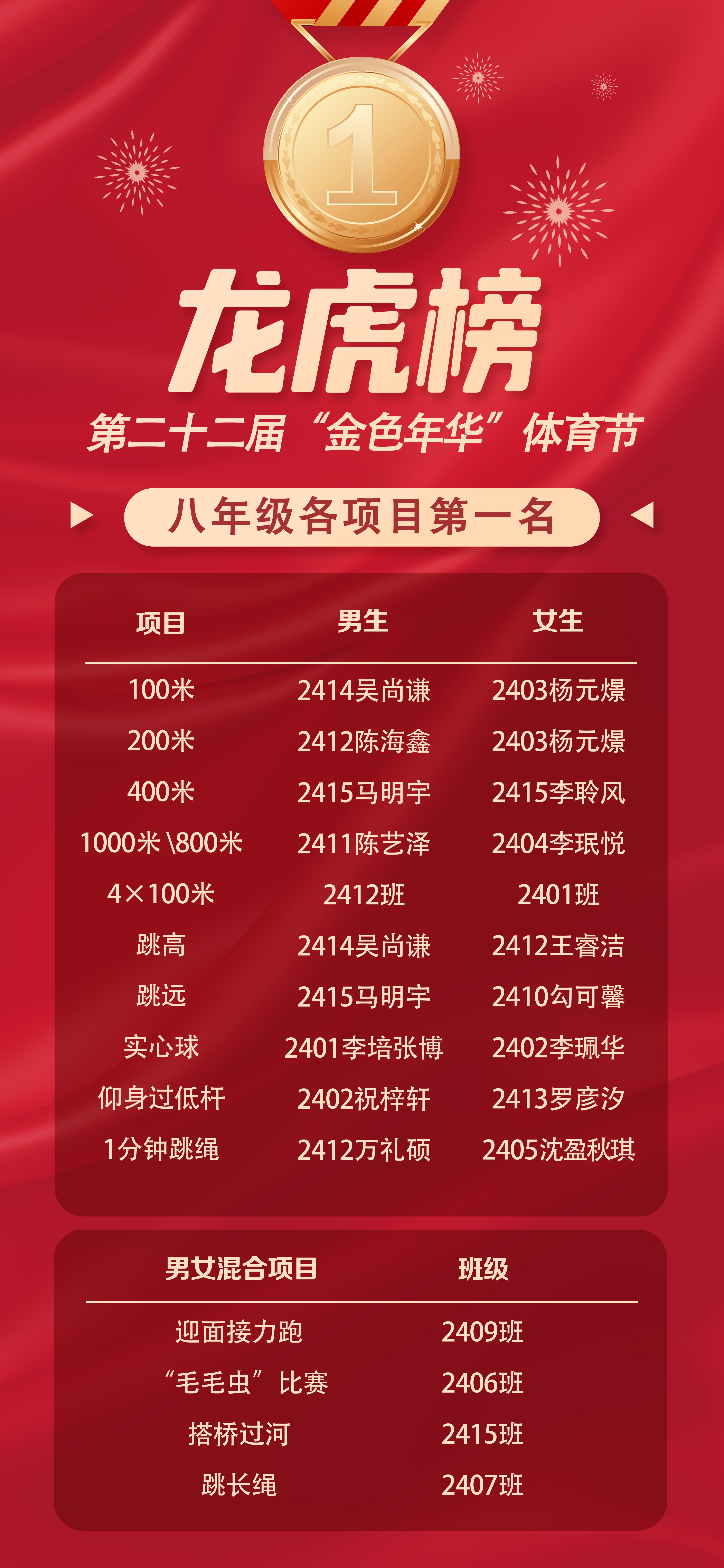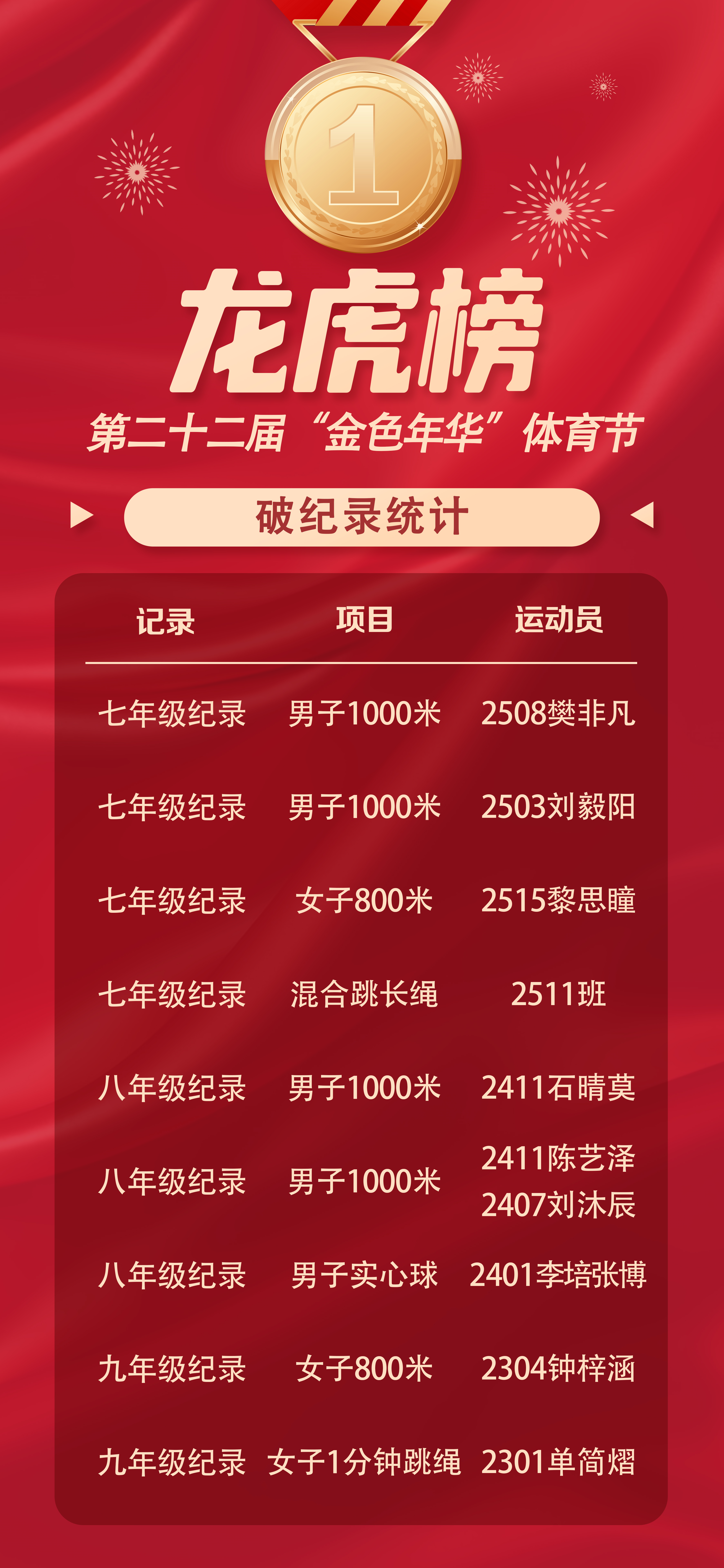 本次体育节中,胜负并不是唯一的标准,超越自我才是最高的勋章。2508班樊非凡打破了七年级男子1000米赛跑校纪录,2515班黎思瞳打破了七年级女子800米校纪录,2511班打破混合跳长绳校记录,2411班石晴莫打破了八年级男子1000米校记录,2411班陈艺泽打破了八年级男子1000米校记录,2401班李培张博打破了八年级男子实心球校纪录,2304班钟梓涵打破了九年级女子800米校纪录,2301班单简熠打破了九年级组女子1分钟跳绳校记录……这些成绩所展现出的不仅是力量与速度的较量,更是一曲青春与梦想的交织。
