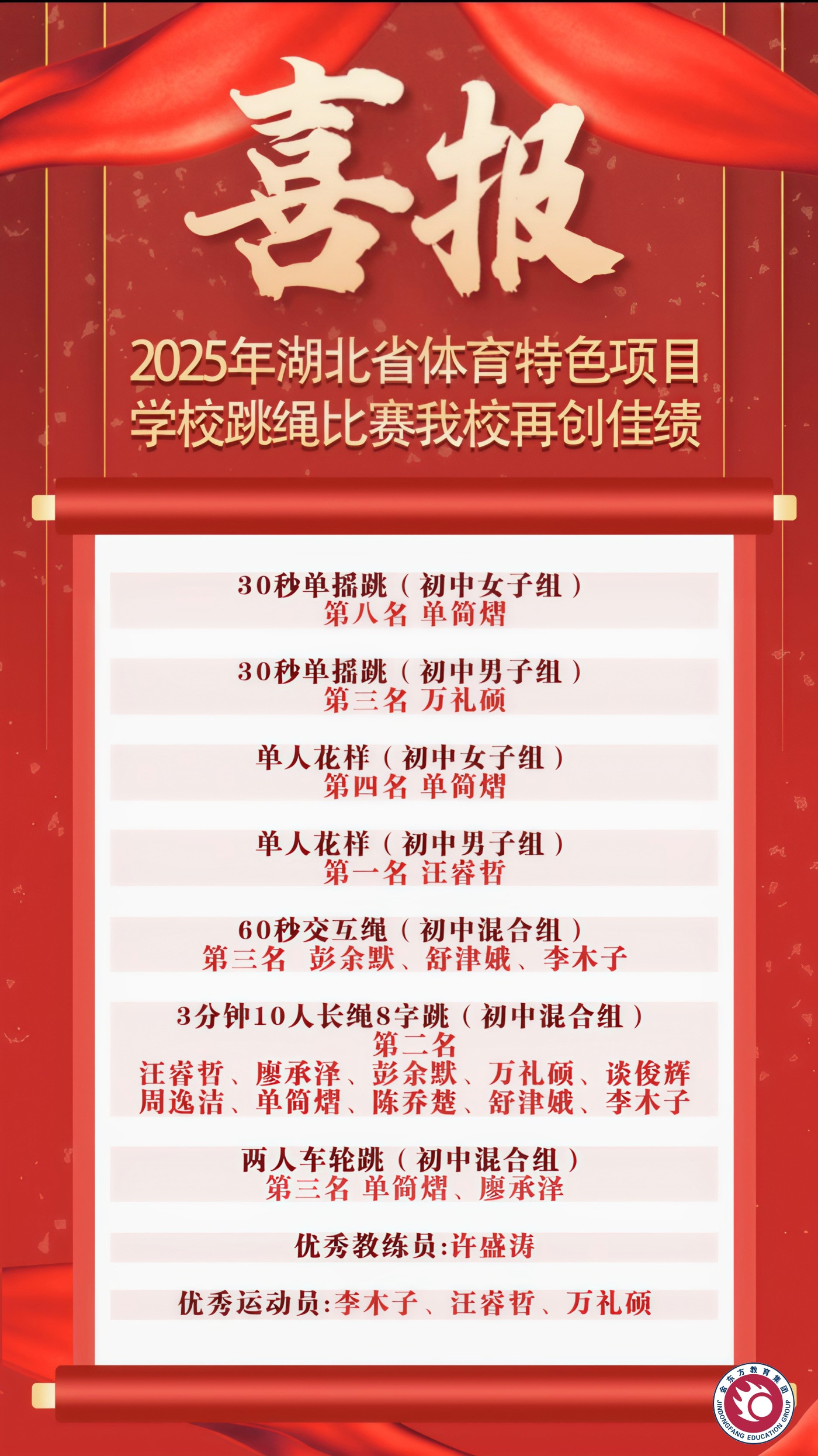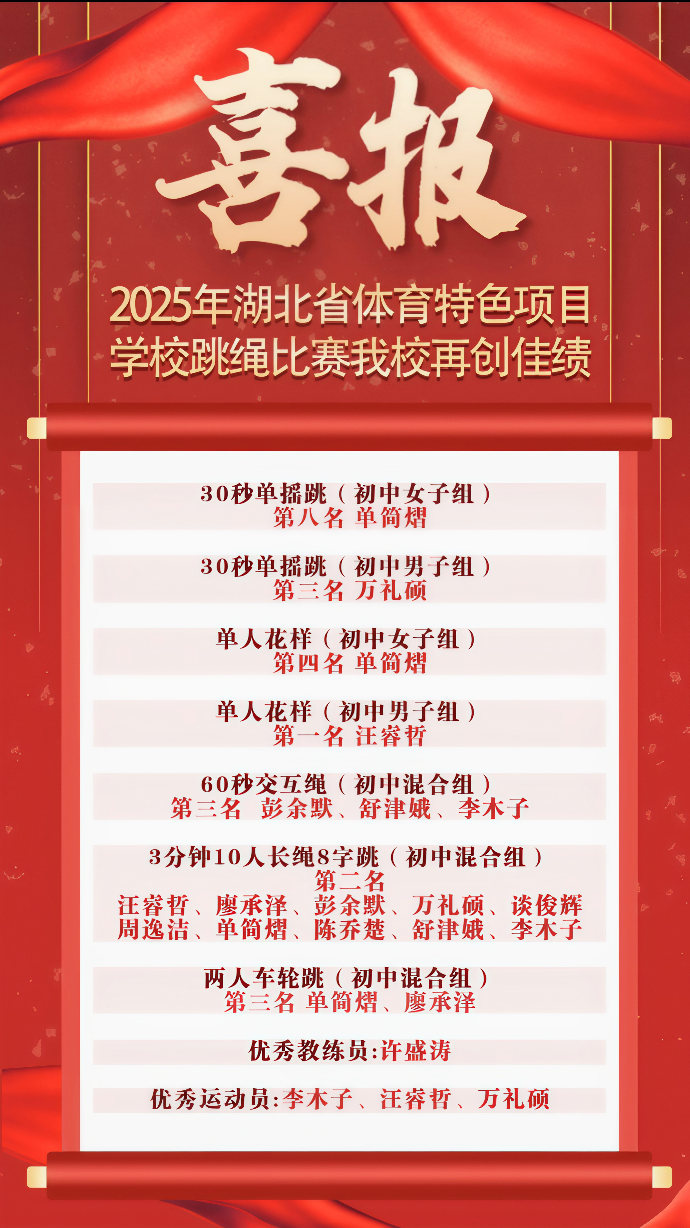 近期,伍家金初跳绳队代表宜昌市参加湖北省体育特色项目学校跳绳比赛。在为期两天的激烈角逐中,面对强劲对手,我校跳绳队员们克服困难,勇于向高难度动作发起挑战,凭借稳定的发挥和出色的表现,最终在众多参赛队伍中脱颖而出,斩获一枚金牌、一枚银牌、三枚铜牌的亮眼成绩,为宜昌市和学校赢得了荣誉。