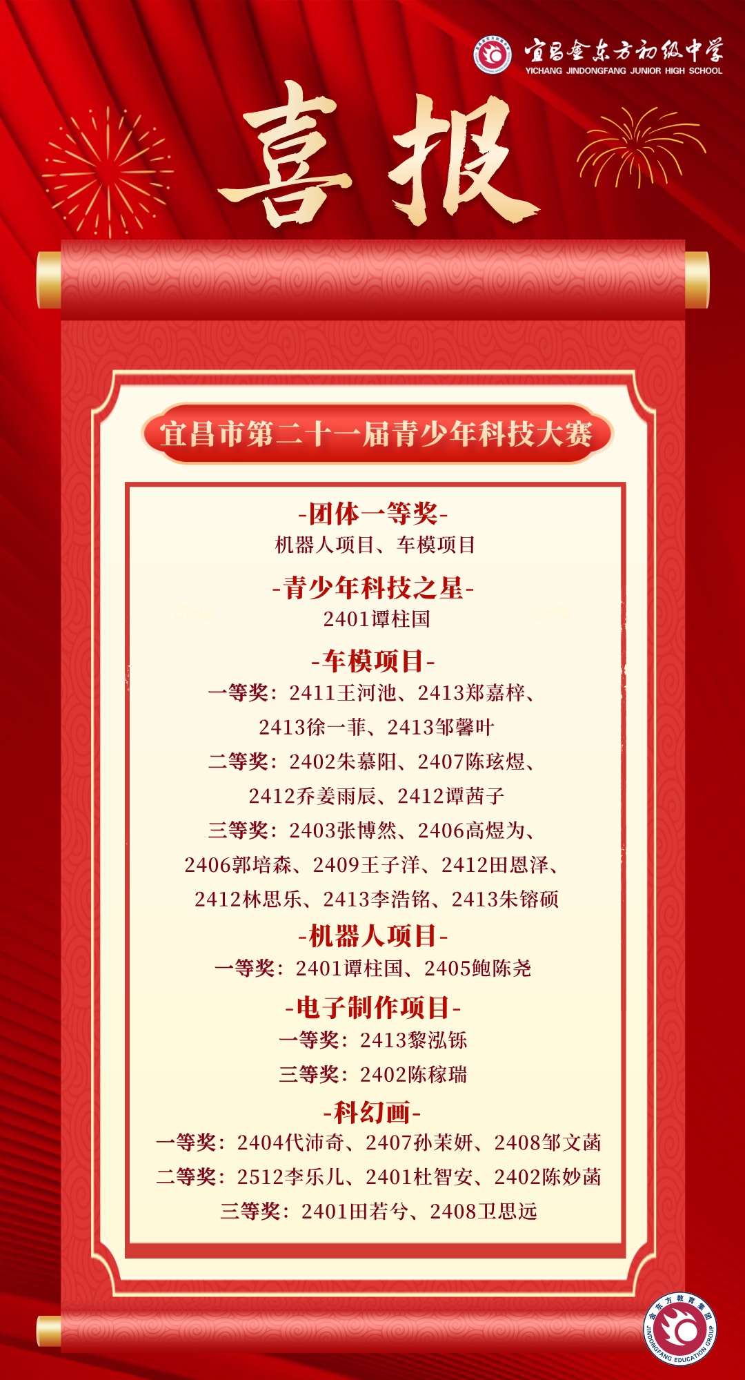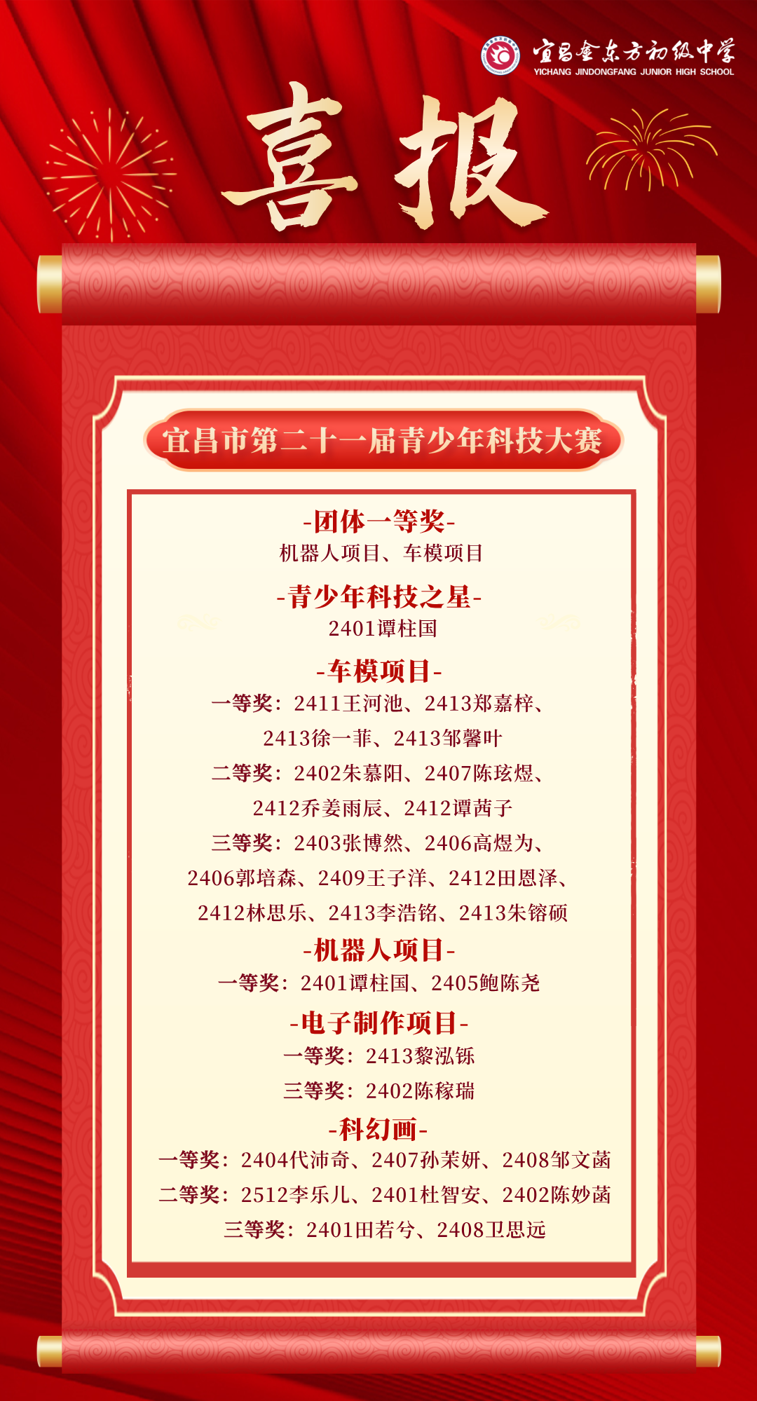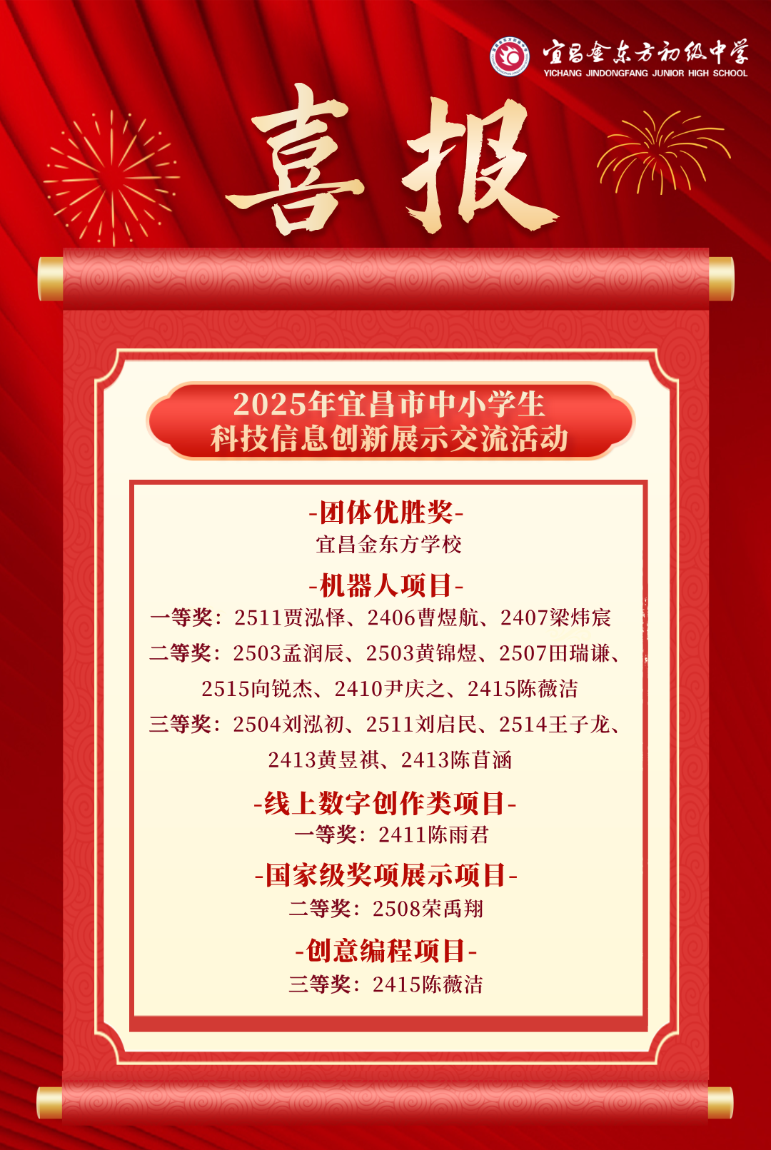 在信息科技领域,金初学子在“宜昌市中小学生科技信息创新交流活动”中荣获团体优胜奖;在“青少年科技大赛”中,金初学子夺得机器人、车模项目团体一等奖,2401班谭柱国同学获评“青少年科技之星”。