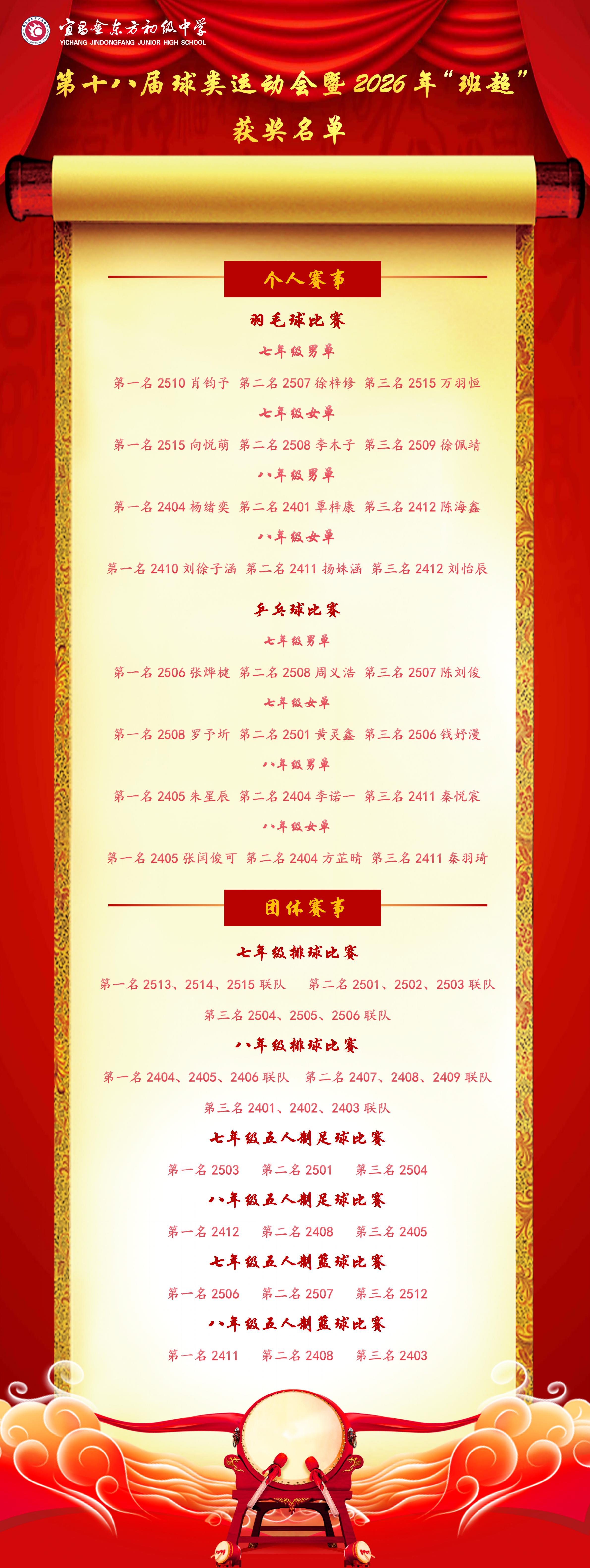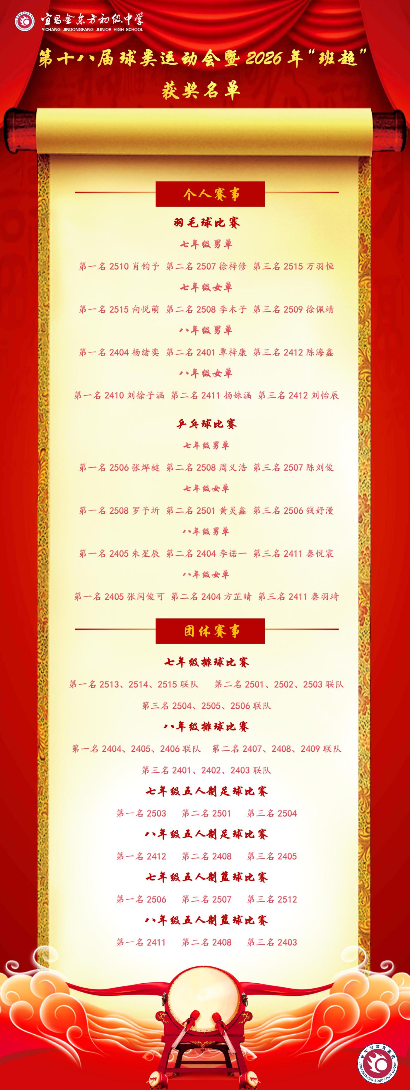 4月23日,伍家金初为期一个月的第十八届球类运动会暨2026年“班超联赛”圆满闭幕,学校为本届赛事中表现突出的班级和运动员举行了颁奖仪式。